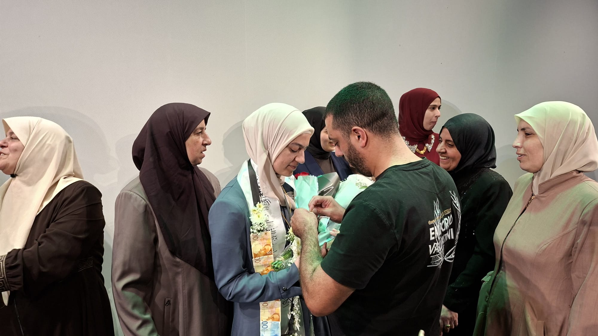 تواصل الحفل بفقرةٍ مهيبةٍ شكّلت ذروة الحدث، وهي فقرة تكريم وتتويج حافظتَيْ القرآن الكريم والطالبتَيْن في كلية الطب العام: الدكتورة آية يحيى جبارين والدكتورة عائشة عبد الجواد محاميد.